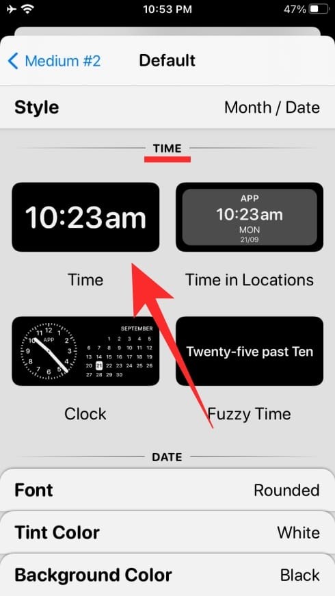 这将加载不同的样式。在这里,选择要在“时间”部分下设置的样式以创建时间小部件。从屏幕上的可用选项之一中进行选择。