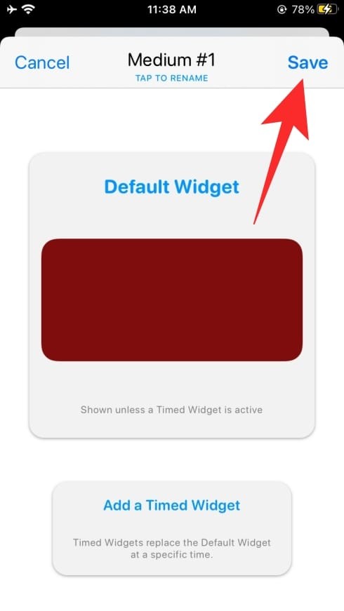 您可以通过点击当前小部件名称下突出显示的“轻按以重命名”选项来重命名小部件。如果没有,您可以通过点击屏幕右上角的“保存”按钮来继续保存新创建的小部件。