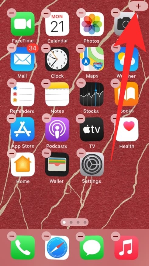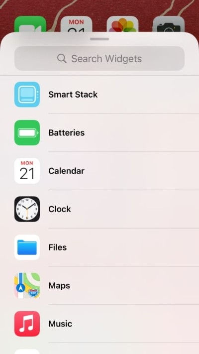 要在主屏幕上添加预设小部件,请点击并按住主屏幕上的空白区域,直到主屏幕上的应用程序和小部件开始抖动。当他们这样做时,点击右上角(或左)角的加号图标,然后从适用于 iPhone 上可用的 Apple 应用程序的预设小部件列表中选择一个小部件。