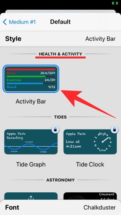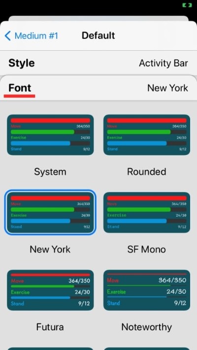 要将活动栏添加到您的主屏幕,请打开 Widgetsmith,选择您首选大小的小部件,然后点击“默认小部件”框。当小部件的样式屏幕加载时,向下滚动到“健康与活动”部分并选择“活动栏”小部件。您可以使用屏幕上可用选项列表中的不同字体自定义此小部件。