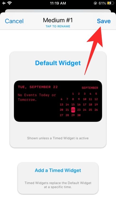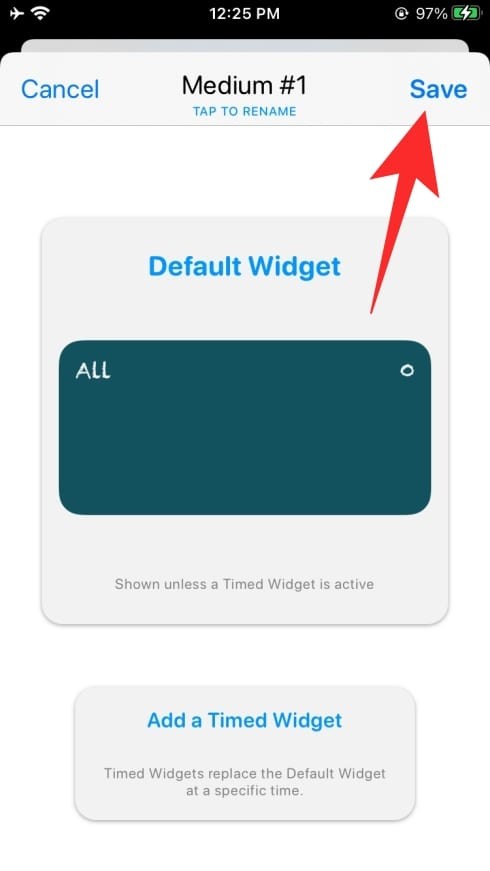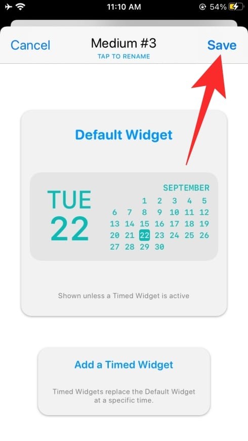 对小部件进行必要的更改后,点击屏幕左上角的小部件名称,然后点击右上角的“保存”按钮保存新创建的小部件。您新创建的小部件已保存到 Widgetsmith,您可以像往常一样将其应用到主屏幕。