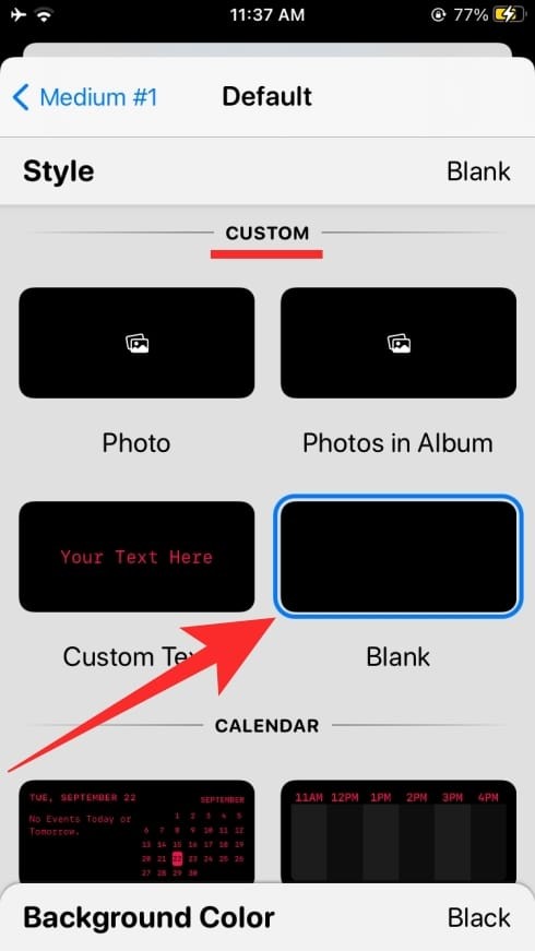 这将打开小部件的样式屏幕,在这里,您需要向下滚动到“自定义”部分。在此部分中,从可用的四个选项中选择“空白”样式。由于这是一个空白小部件,您只需选择一个选项即可设置为您的“背景颜色”。