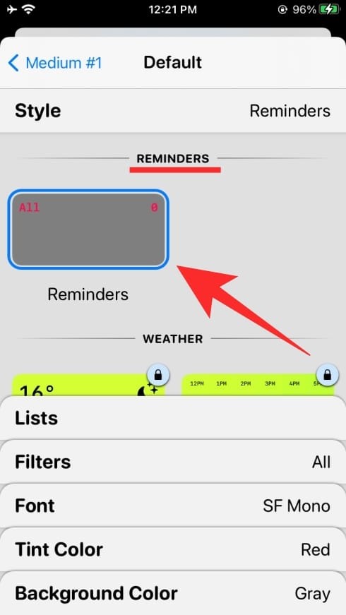 要将自定义提醒小工具添加到您的主屏幕,请打开 Widgetsmith,选择您喜欢的大小的小工具,然后点击“默认小工具”框。当小部件的样式屏幕打开时,向下滚动到“提醒”部分并选择“提醒”小部件。