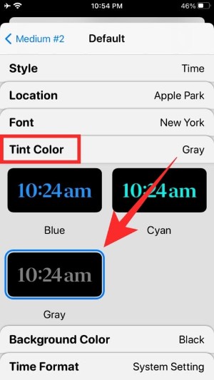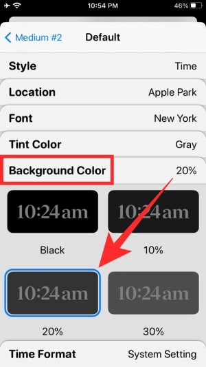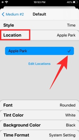 您可以通过选择不同的选项(位置、字体、色调颜色、背景颜色和时间格式)来自定义这些小部件中的每一个。要设置不同的值或选择一个选项,您必须点击这些部分中的每一个,然后选择一个选项,如下所示。