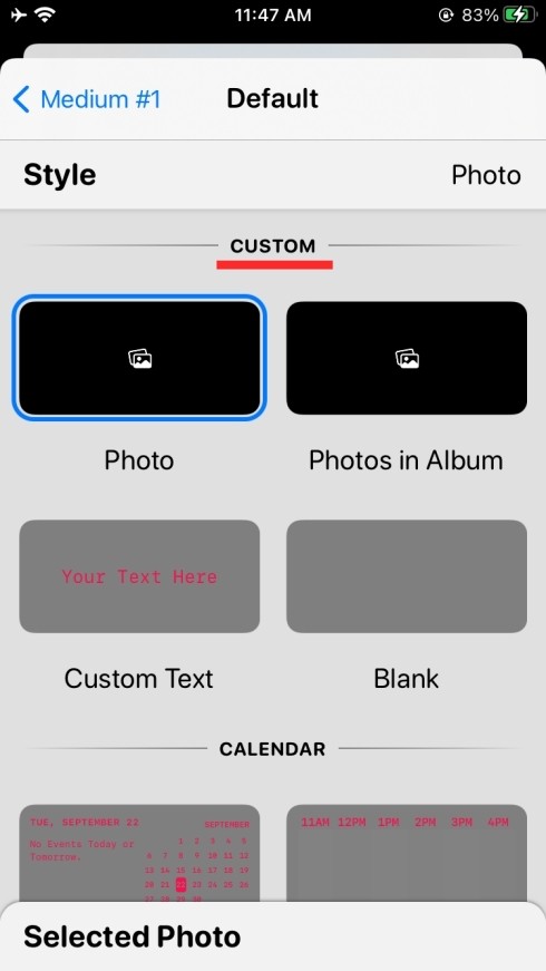 要在主屏幕上自定义照片/文本小部件,请打开 Widgetsmith,选择您喜欢的大小的小部件,然后点击“默认小部件”框。这将打开小部件的样式屏幕,在这里,您需要向下滚动到“自定义”部分。在此部分中,选择以下三种样式中的任何一种 – 照片、相册中的照片和自定义文本。