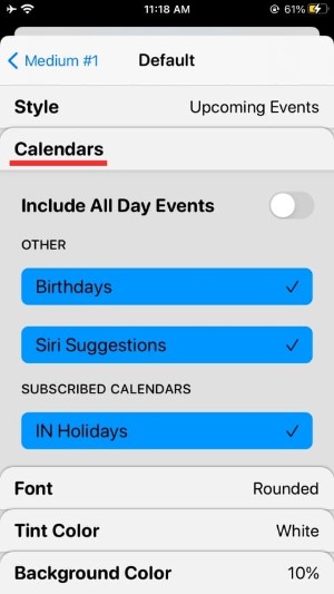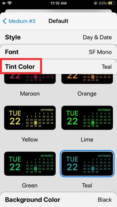 您可以通过选择不同的选项(日历、字体、色调颜色和背景颜色)进一步自定义小部件。要设置不同的值或选择一个选项,您必须点击这些部分中的每一个,然后选择一个选项,如下所示。