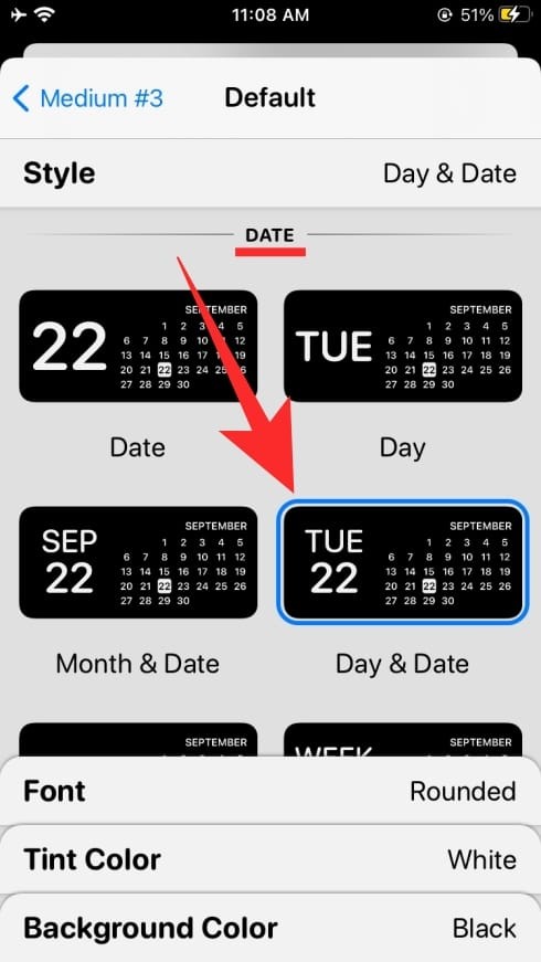 打开 Widgetsmith,选择您喜欢的尺寸的小部件,然后点击“默认小部件”框。这将打开小部件的样式屏幕,在这里,您需要向下滚动到“日期”部分。在此部分中,选择要应用于日期小部件的样式。