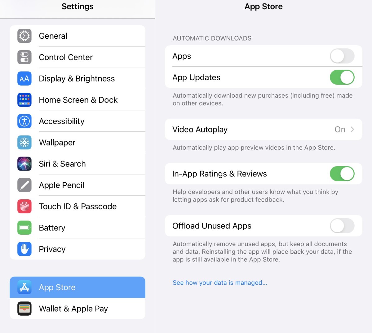 如果你 不 快乐与具有自动下载你的设备上嚼起来的空间,点击设置 ,要么下拉菜单上打开搜索栏和搜索应用程序商店 或 向下滚动到 App Store的 菜单列表。单击它会打开一个名为“应用程序更新” 的选项,您可以使用该选项 启用或禁用自动更新。