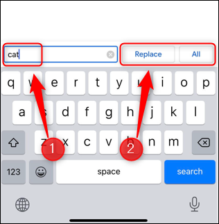 在屏幕键盘的正上方,您会找到替换为框。键入要替换搜索词的词,然后点击“替换”以替换您当前所在词的实例,或点击“全部”以替换文档中该词的每个实例。