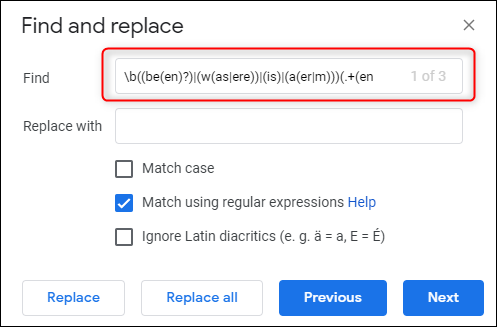 例如,您不仅可以使用 RegEx 搜索特定的单词或短语,还可以搜索语法规则,例如被动语态。因此,例如,如果您是一名教师并希望学生使用主动语态而不是被动语态,您可以使用此 RegEx 模式来搜索文档中的每个被动语态实例: