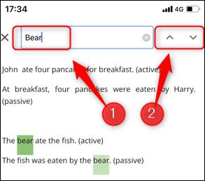 使用屏幕键盘在下一个屏幕顶部的文本框中键入搜索词。您可以使用向上或向下箭头在文档中该单词的每个实例之间导航。
