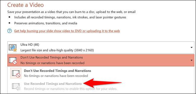 要将录制的时间和旁白包含在您的视频中,然后在视频质量菜单下方,单击“不使用录制的时间和旁白”选项。