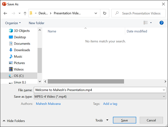 您计算机的标准“保存”窗口将打开。在这里,选择用于保存视频的文件夹,输入视频名称,然后单击“保存”。