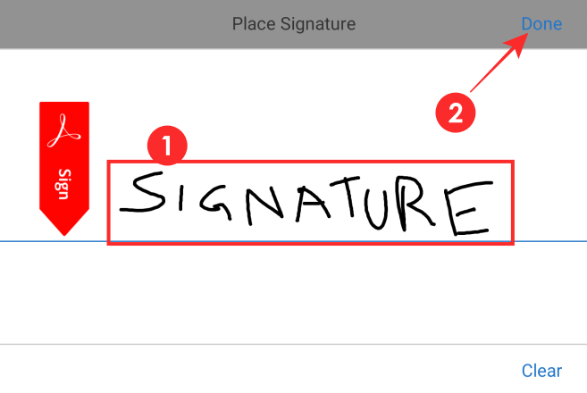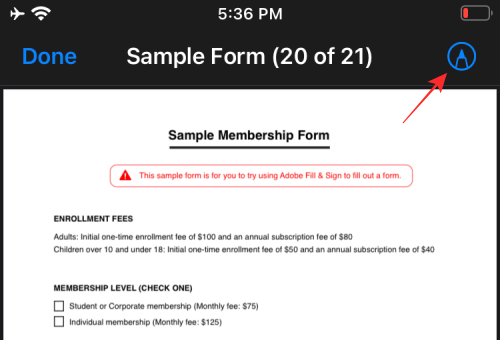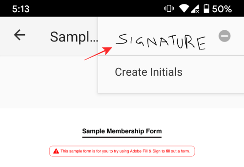 与 iOS 上的 Adobe Fill & Sign 应用程序不同,您无法键入或添加来自其他图像的签名。在 Android 版本的应用程序上,您必须在屏幕上绘制签名,然后点击右上角的“完成”按钮。