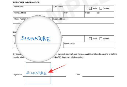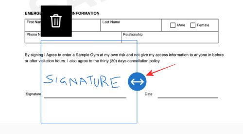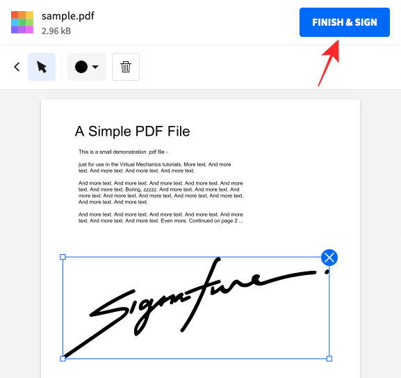 签名将添加到 PDF 中。将其拖动并移动到您希望它正确定位的任何位置。您还可以通过单击并拖动签名旁边的角并将其拖动到您喜欢的大小来放大签名。