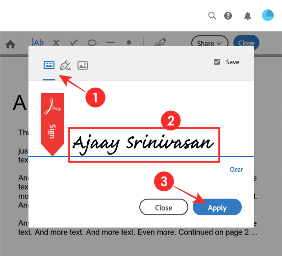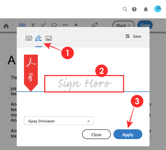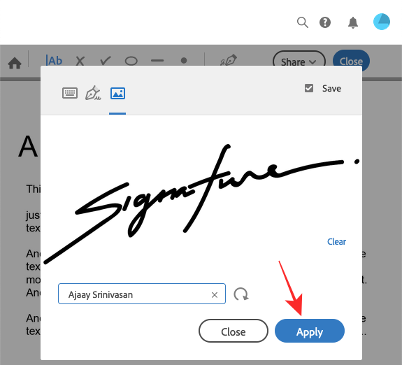 上传您的签名后,它会出现在屏幕上。要将其添加到 PDF 文档,请单击“应用”选项。
