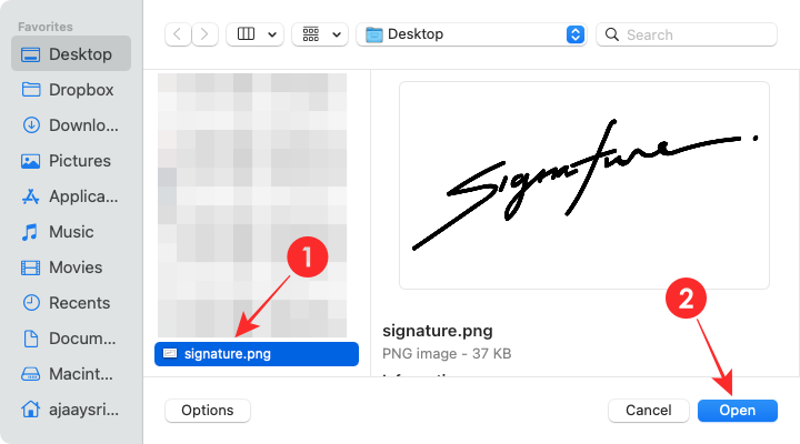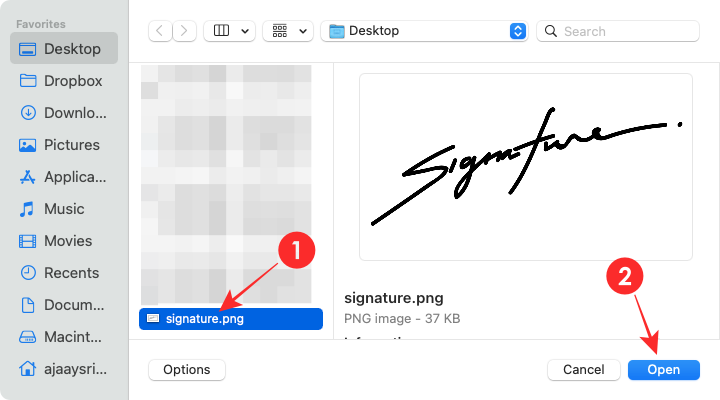 在出现的弹出窗口中,找到并选择您的签名图像文件,然后单击“打开”选项。