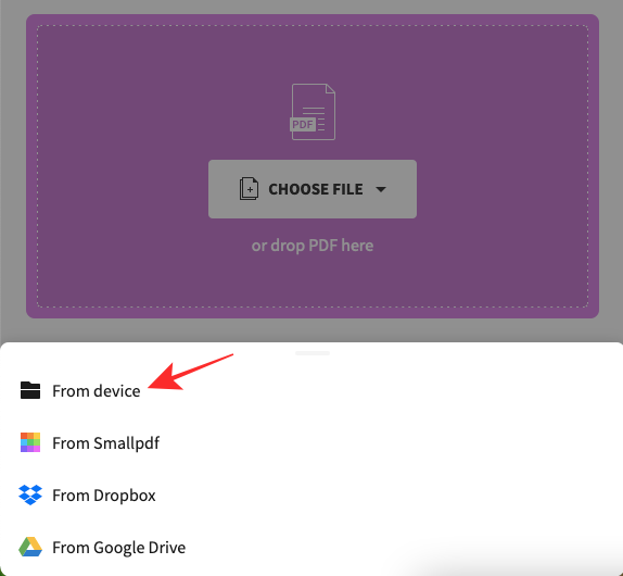 屏幕上会弹出一个菜单,询问您何时要从中上传 PDF 文件。选择“从设备”选项以从本地存储中选择文件。