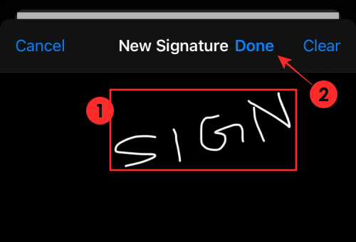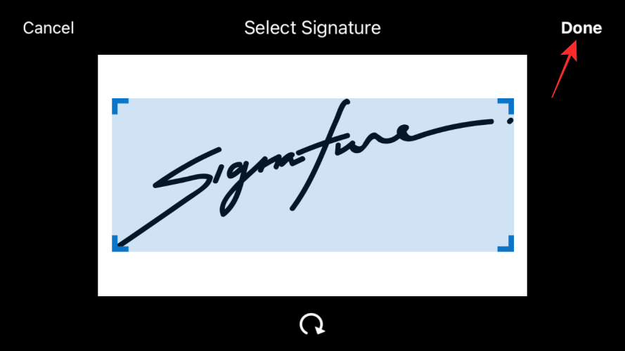 在下一个屏幕中,您将能够看到您的签名。确保您的整个签名已被选中,然后点击右上角的“完成”按钮。