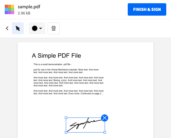 当您点击“完成”时,您的签名将被添加到文档中。您可以点击并拖动签名以移动到 PDF 文件的首选位置。您可以通过点击并拖动它的任何角来放大它。
