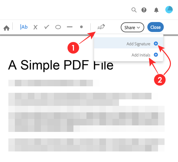 要向 PDF 添加签名,请单击顶部工具栏中的签名图标,然后根据要添加到文档的内容选择“添加签名”或“添加姓名首字母”选项。