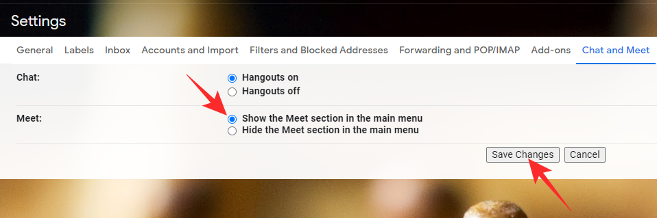 大菜单打开后,转到“聊天和见面”选项卡。最后,通过选择“在主菜单中显示会议部分”,确保主菜单上显示“会议”选项卡。点击“保存更改”并让 Gmail 重新加载。