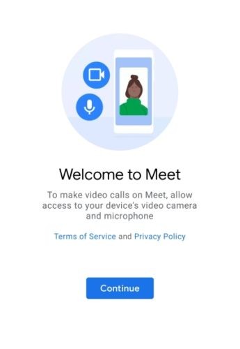 选择帐户并成功注册后,Google Meet 会请求访问您的相机和麦克风的权限。单击“继续”以继续。