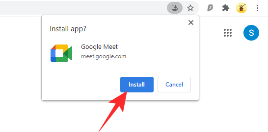 如果您无法定期访问 Google Meet 网站,您可以通过在 Google Chrome 上访问 meet.google.com 下载 Google Meet 网络应用程序。现在,单击屏幕右上角或地址栏右侧的下载按钮。