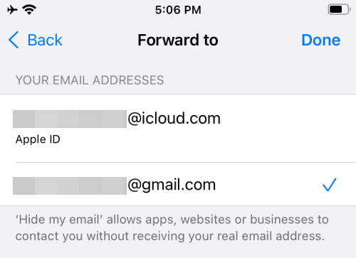 只要您不关闭电子邮件转发或停用“隐藏我的电子邮件”地址,您将继续收到来自您使用“隐藏我的电子邮件”注册的服务的未来电子邮件。