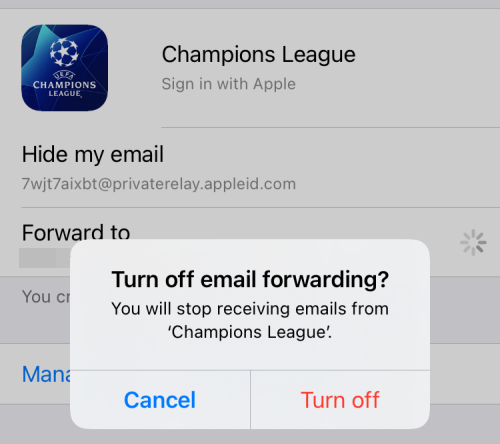 相比之下,关闭“@privaterelay.appleid.com”地址的电子邮件转发只会禁用与该电子邮件地址关联的一项服务的未来消息。