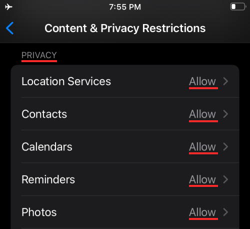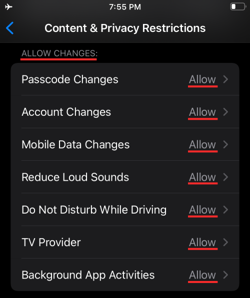 除了一些隐私设置之外,iOS 在处理其他设置(例如更改密码、帐户、移动数据、声音、DND 模式、电视提供商和后台应用程序活动)时也会采用限制。根据您希望它们的配置方式,您可以将全部或部分设置为“允许”以防止限制。