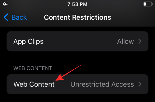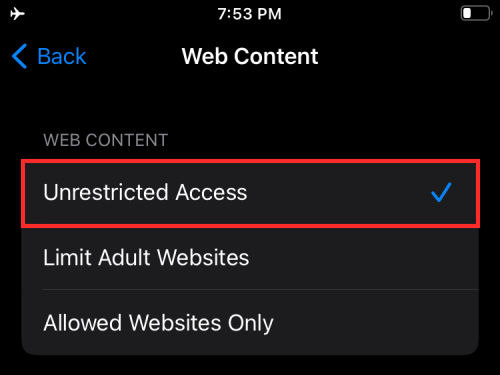在“Web 内容”屏幕内。选择最适合您的偏好的选项。您可以选择适合您的选项,具体取决于您是希望让您的设备访问所有网站,还是添加对比之前批准的网站更多网站的访问权限。