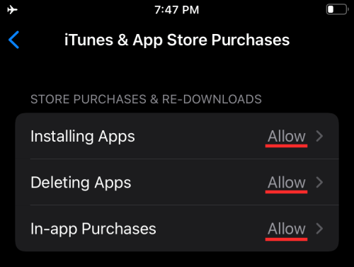 如果您不允许在其他设备上使用“安装应用程序”和“删除应用程序”的此类功能,您还可以选择其中任何一个功能并选择“允许”关闭您之前可能设置的限制。