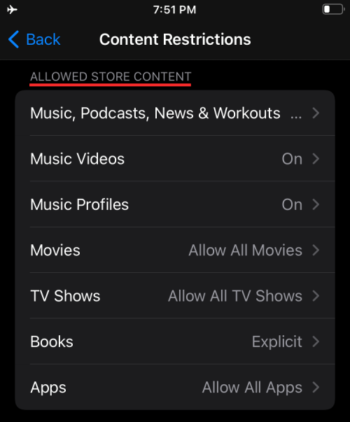 如果您想保持“内容和隐私限制”选项处于启用状态,但想单独取消对 iPhone 上不同类别的限制,您可以查看接下来的几个部分。