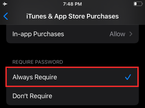 注意:我们建议您将“需要密码”部分设置为“始终需要”,以确保不会自动安装应用程序并且不会快速进行购买。