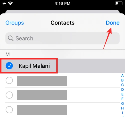 联系人屏幕现在将从底部弹出。滚动您的联系人列表,选择您希望在 Focus 内列入白名单的联系人。您还可以使用顶部的搜索栏一一搜索联系人。添加所有要列入白名单的联系人后,点击右上角的“完成”。