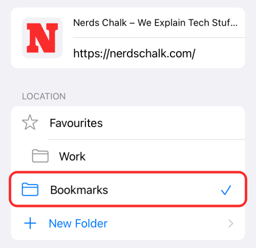 在此之下,您还应该能够看到书签将保存到的位置。您可以通过点击它并选择您喜欢的书签文件夹或创建一个新文件夹来更改此位置。
