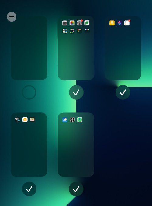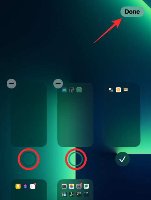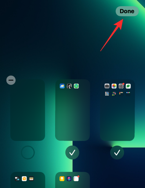 当您以网格格式访问主屏幕时,您可以通过点击页面缩略图底部的勾号标记取消选中来隐藏您可能在其上创建的一些页面。在此屏幕上进行所有必要的更改后,点击右上角的“完成”。