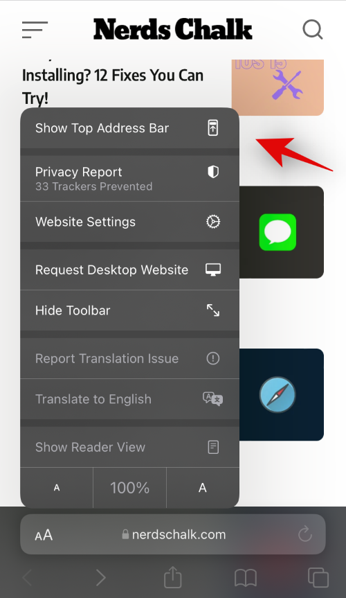 您可以将 Safari 地址栏移动到屏幕顶部。如果你这样做,那么你将失去标签栏视图和在打开的标签之间滑动的能力。要移动它,请在网页打开时点击“ Aa ”图标,然后选择“显示顶部地址栏”。