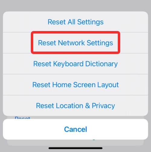 由于“最后一行不再可用”错误表明您的 e-SIM 卡存在问题,因此重置一次网络设置并不是一个坏主意。要重置您的网络设置,请前往“设置”>“通用”>“传输或重置 iPhone”>“重置”,然后从弹出菜单中选择“重置网络设置”。