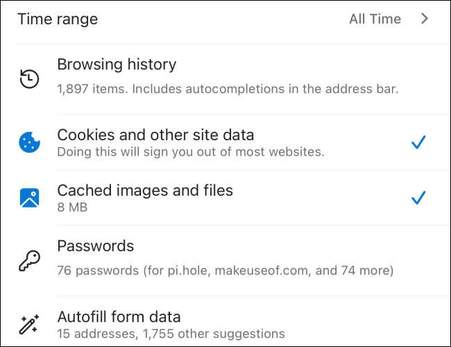 点击“时间范围”并选择“所有时间”。选择要从 Microsoft Edge 中删除的项目。