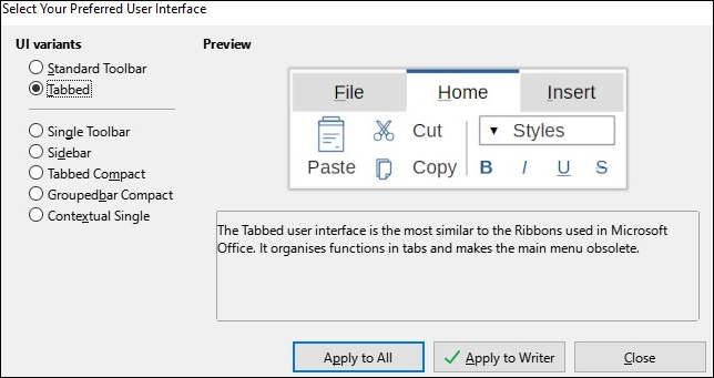 这使您可以保留传统的 LibreOffice 菜单栏,或选择“与Microsoft Office 中使用的功能区最相似”的内容。