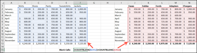 =COUNTBLANK(B2:F12)+COUNTBLANK(J2:N12)