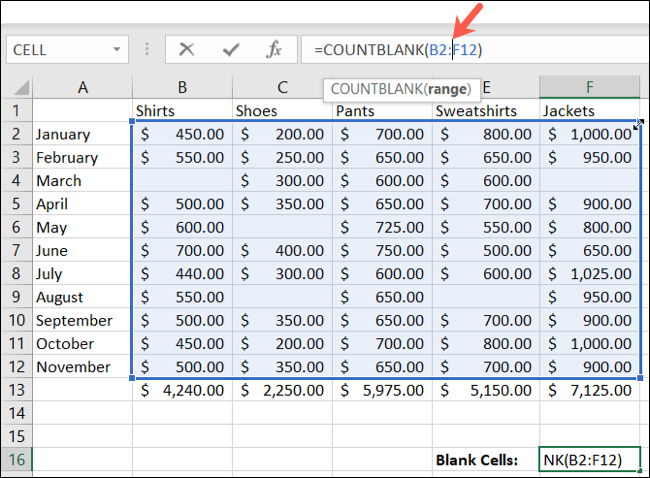然后,您应该会看到您为公式选择的范围内的空单元格数。