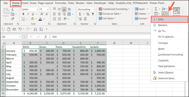 选择包含要查找的空白的单元格。转到主页选项卡,然后单击功能区编辑部分中的查找和选择下拉箭头。选择“查找”。