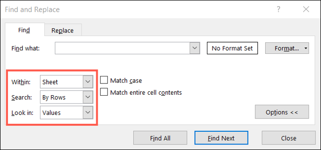 当“查找和替换”窗口打开时,将“查找内容”框留空。然后,单击“选项”以展开底部的部分。