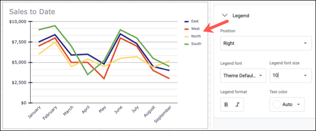 尽管您可以在 Google 表格中更改其他类型图表的图例,但您可能需要为折线图修改其他内容。