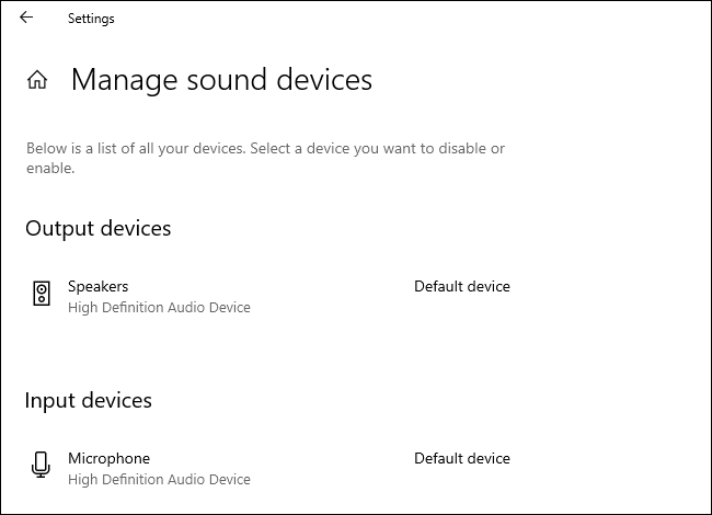 微软还在声音设置面板中添加了更多传统的控制面板功能。“设置”>“系统”>“声音”>“管理声音设备”页面现在会告诉您默认的声音设备是哪个,然后选择默认的声音设备。