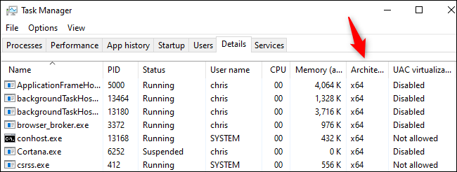 在Windows任务管理器现在可以告诉你每一个正在运行的进程的体系结构。要查看此信息,请单击任务管理器中的“详细信息”选项卡,右键单击列表中的标题,然后单击“选择列”。启用“架构”复选框,然后单击“确定”。