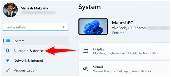 在设置的左侧边栏中,单击“蓝牙和设备”。